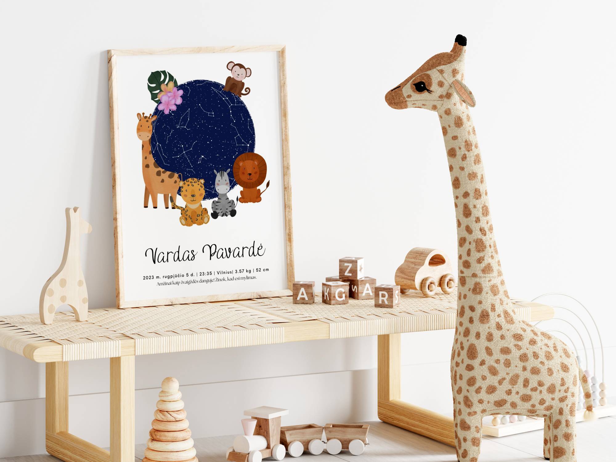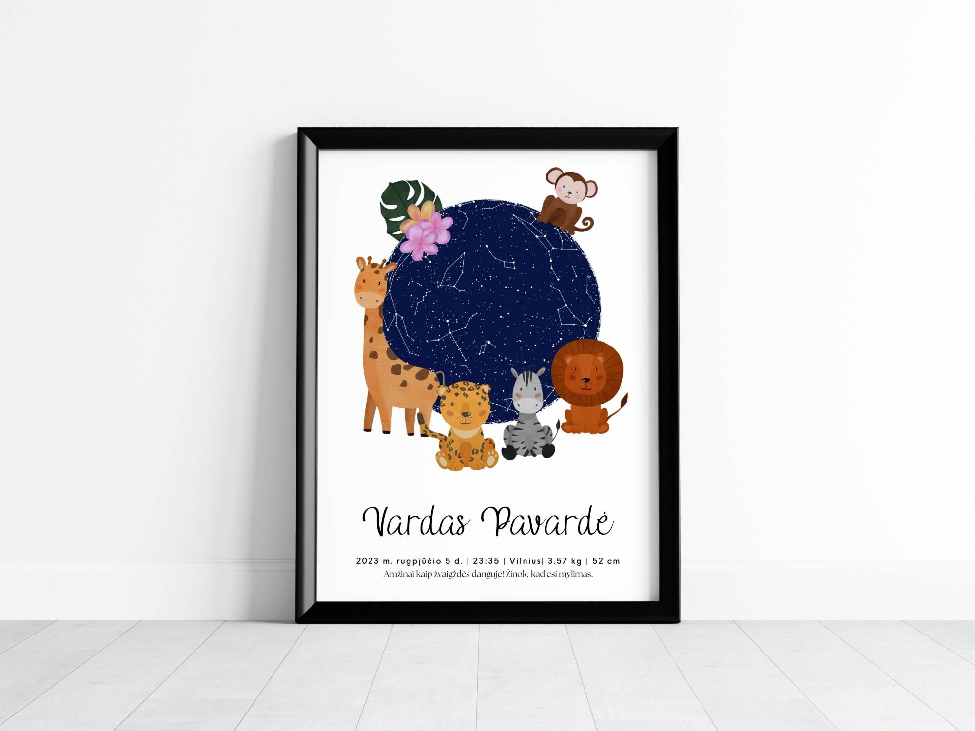 Įamžinkite savo vaiko gimimą žaisminguose „Džiunglėse” metrikuose su tiksliu gimimo momento žvaigždžių išsidėstymu. Plakato apačioje nurodyta pagrindinė informacija – vardas, gimimo ūgis, svoris, gimimo data, laikas bei vieta. Taip pat – priminimas jūsų vaikui, kad jis visuomet bus mylimas! Šie žavūs gimimo metrikai ne tik papuoš jūsų vaiko kambarį, bet ir padės tyrinėti žvaigždėtą dangų kartu.