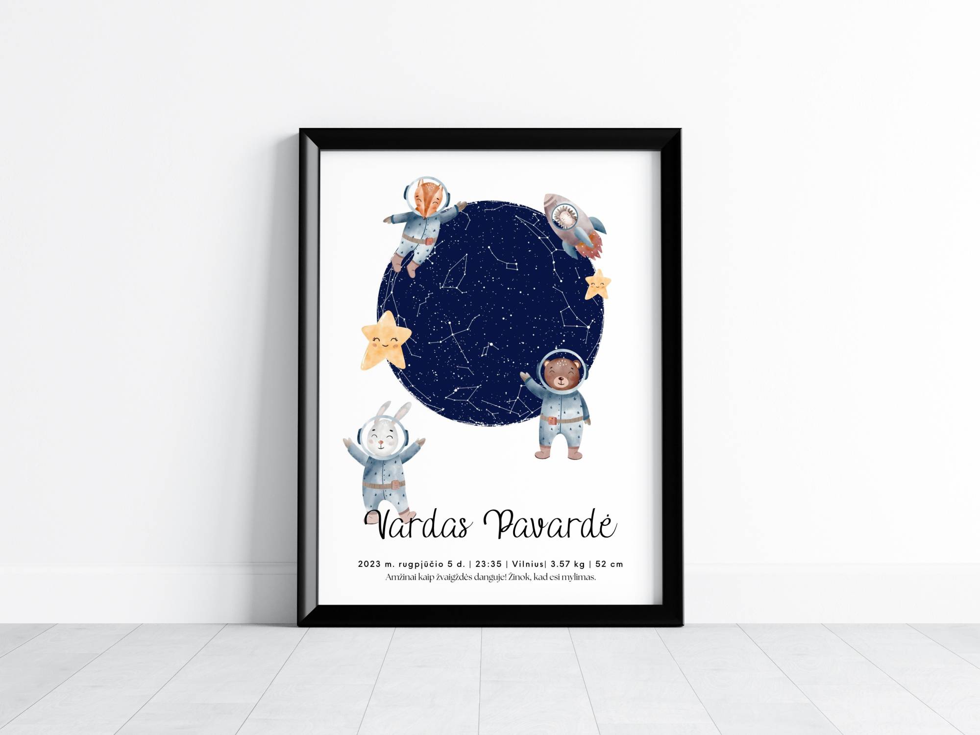 *Šie gimimo metrikai buvo kurti kaip priminimas vaikui, kad jis visuomet bus mylimas! Jeigu gimimo metrikuose pageidaujate asmeninės citatos – ją įrašykite „Citatos” laukelyje užsakant. Palikus tuščią „Citatos” laukelį, bus įrašyta „Amžinai kaip žvaigždės danguje! Žinok, kad esi mylima (-as).”