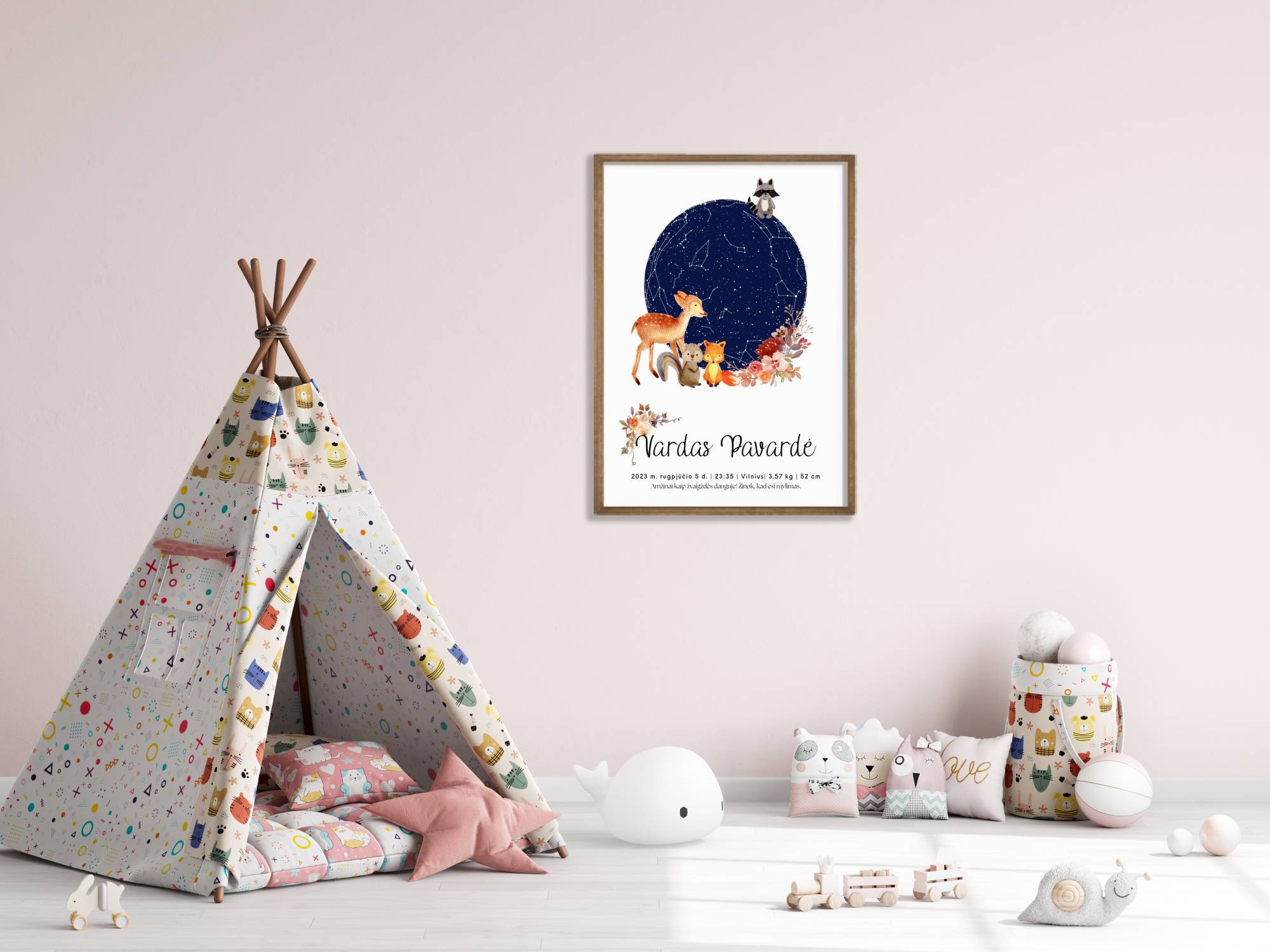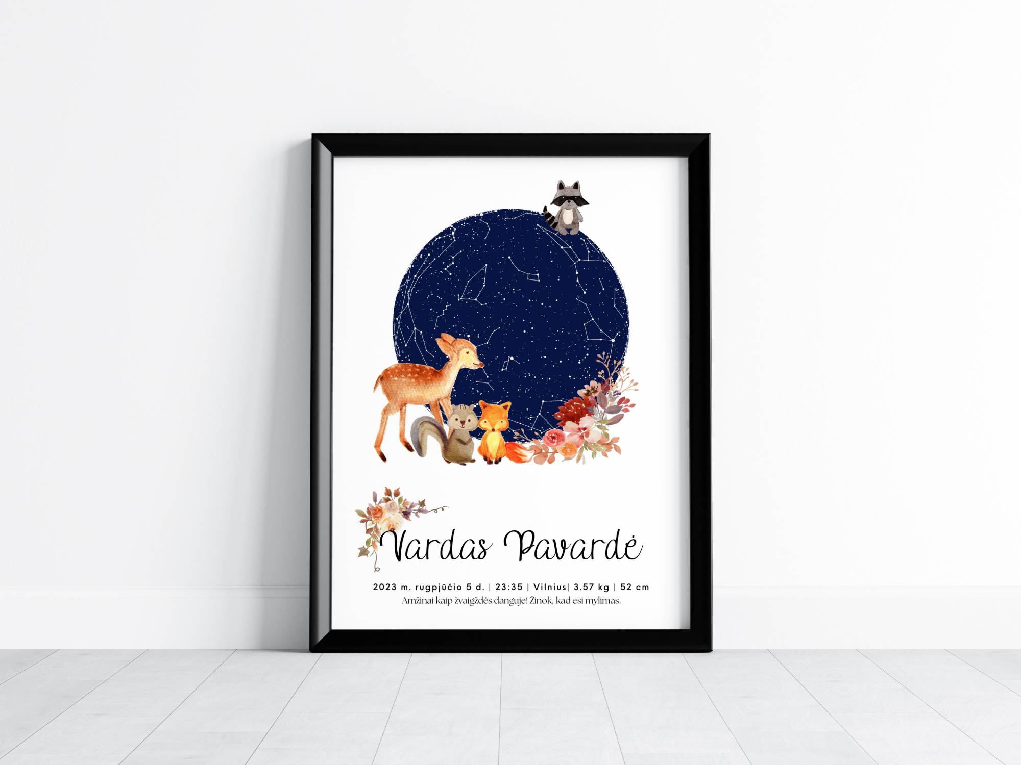 Leiskitės į užburiančią kelionę po kerintį žvaigždėtą dangų su mūsų asmeniniais gimimo metrikais- žvaigždėlapiu. Šie gimimo metrikai yra unikalus ir prasmingas būdas įamžinti svarbiausią jūsų gyvenimo akimirką – vaiko gimimą. Jie ne tik papuoš jūsų vaiko kambario sienas, bet ir padės išsaugoti magiškas akimirkas atmintyje.