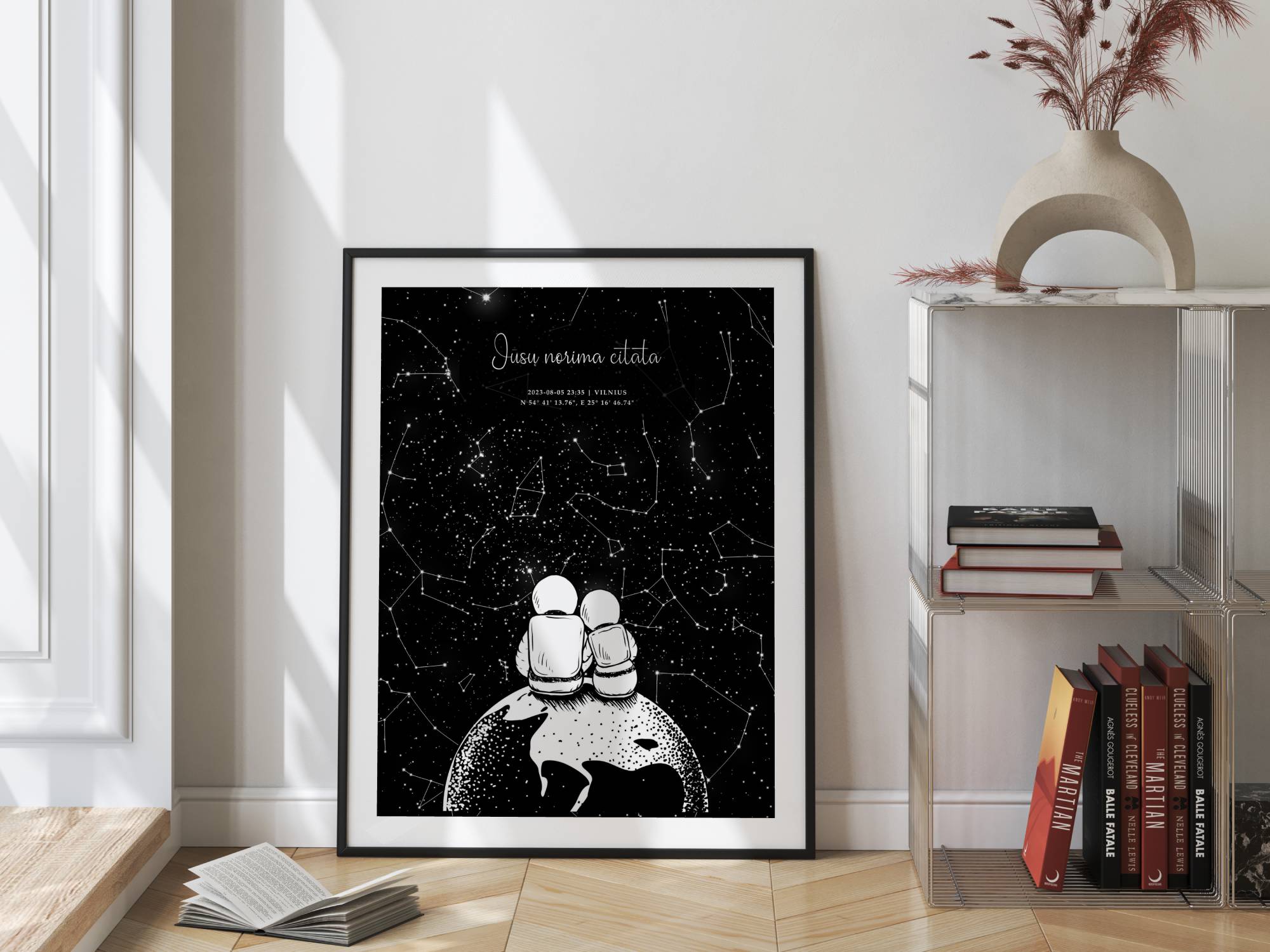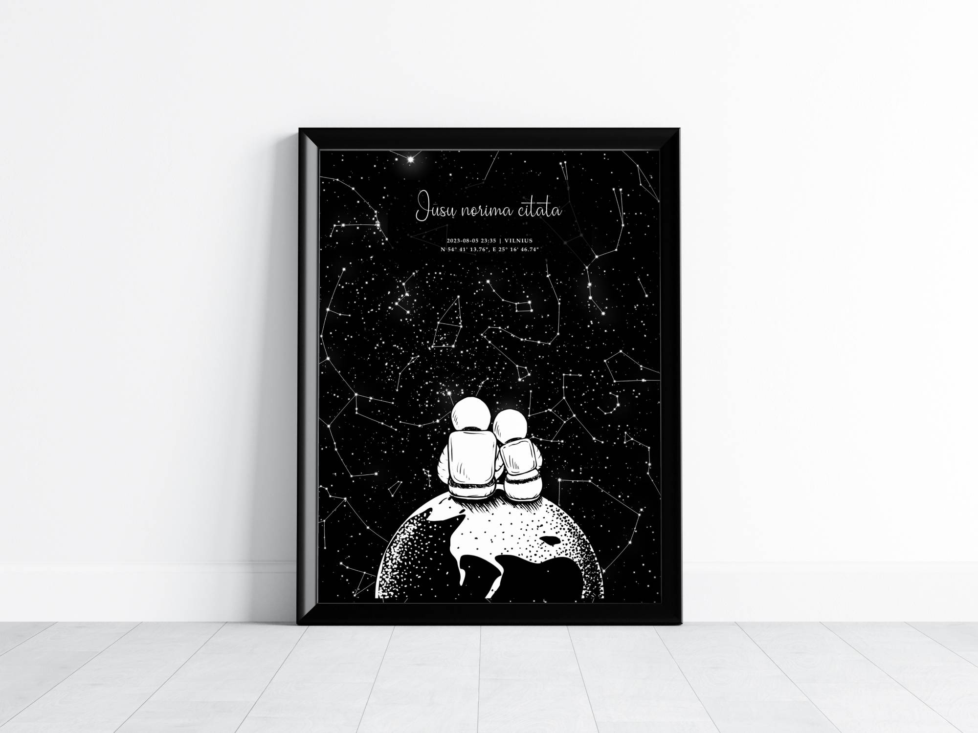 2. Sukuriamas žvaigždėlapio maketas spaudai įtraukiant sukurtą dangaus vaizdą, vardus bei jūsų norimą citatą.