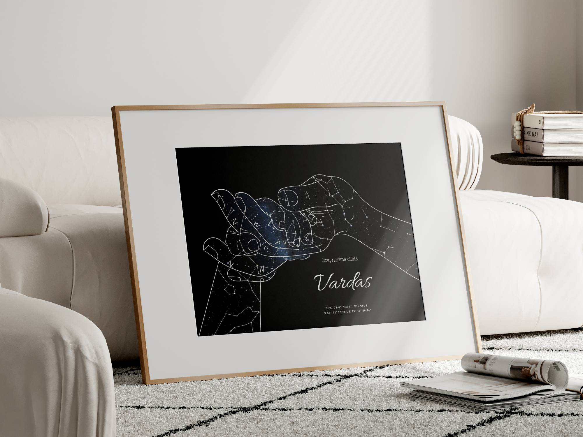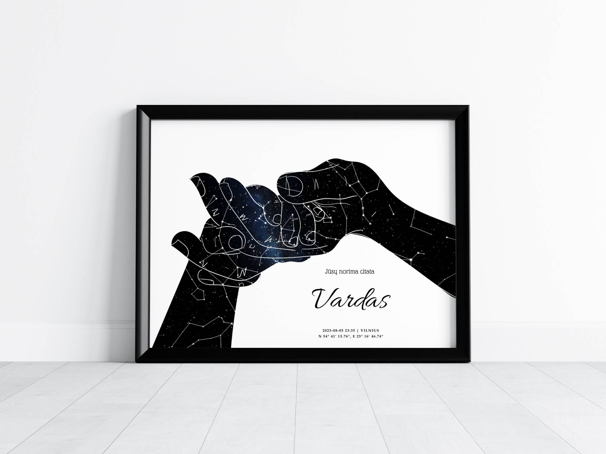 Įamžinkite savo ypatingos akimirkos magiją asmeniniame žaismingos rankų formos žvaigždžių žemėlapio plakate. Žvaigždėlapis „Rankos”, atvaizduojantis tikslų žvaigždžių išsidėstymą pagal Jūsų nurodytas detales (datą, laiką bei vietą), ne tik elegantiškai papuoš Jūsų ar jums brangių žmonių namus, bet ir padės išsaugoti magiškas akimirkas atmintyje.